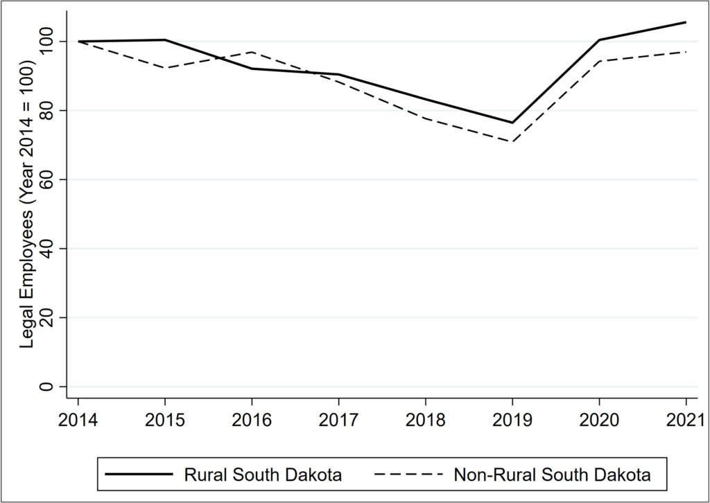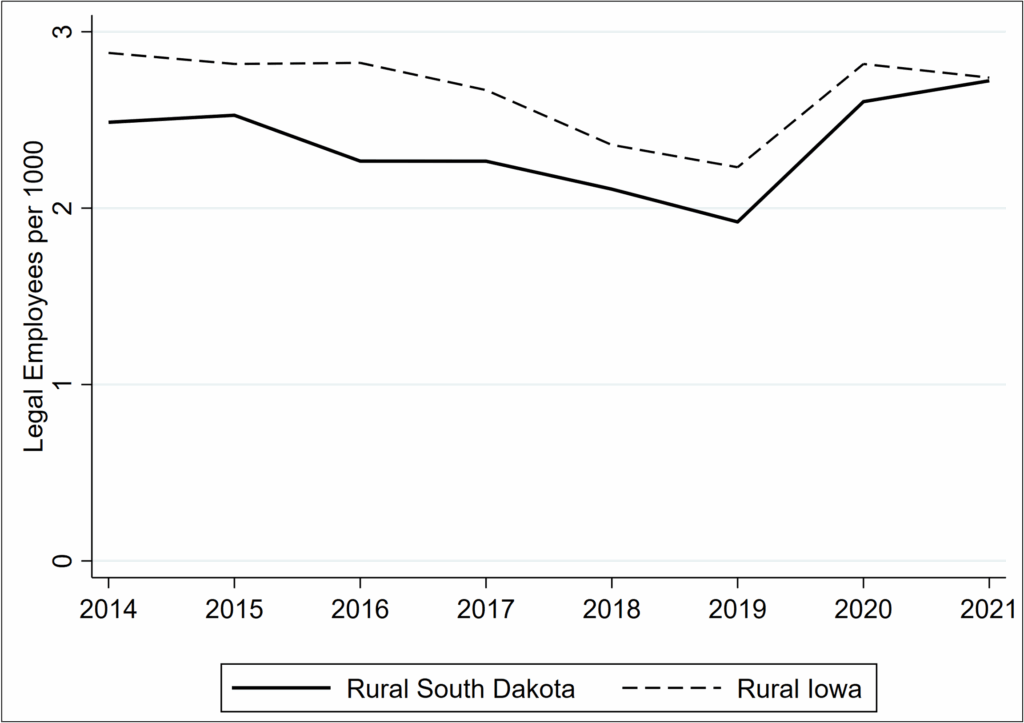 Schaefer was also interested in pay. In particular, he was intrigued by the South Dakota Rural Attorney Recruitment Program, which offered a “real-life science experiment.” Could a stipend make enough of a difference to incentivize lawyers to serve South Dakota over the program’s nearly decade existence? Comparing nonrural counties in South Dakota, rural counties in Iowa, and rural counties in South Dakota over the period of the Recruitment Program’s existence showed substantial gains toward “mitigating the rural legal desert problem in South Dakota,” his study notes. In 2014 the “rural legal coverage gap” between South Dakota and Iowa was roughly 0.5 attorneys per 1,000 residents. In seven years, that gap almost disappeared.